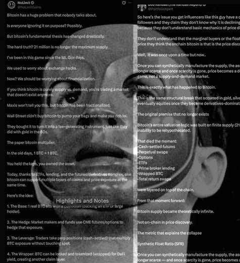 then - the large accounts have a rewarding feedback loop - the authority they have lets them be experts to some opinion - then leaving little work to actually harness or develope the content or ideas from infancy. say you are monetarily influenced to post high engagement activity - if looking at this from that monetary engagment makes the most sense to just “repurpose other content that is already doing well” example below of a post i have seen all large accounts post in a different form. here is two examples - accounts proporting the bitcoin sell off comes from the fact it is derivative the fuck out of this point each bitcoin can be traded/borrowed 5 times making it not as scarce as it appears -