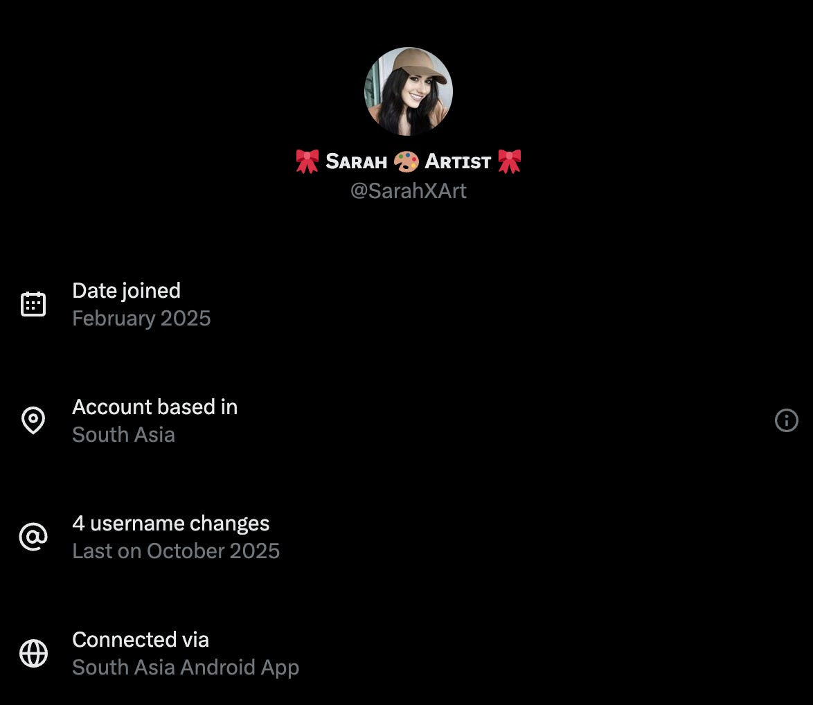 so then i am even more curious this woman the ai in her photo she posted looks much better then the slop she is reposting looks more nanobanana esq so more realistic still something is off with her profile. ah i see she is a white woman in suburbia who is from south asia. right